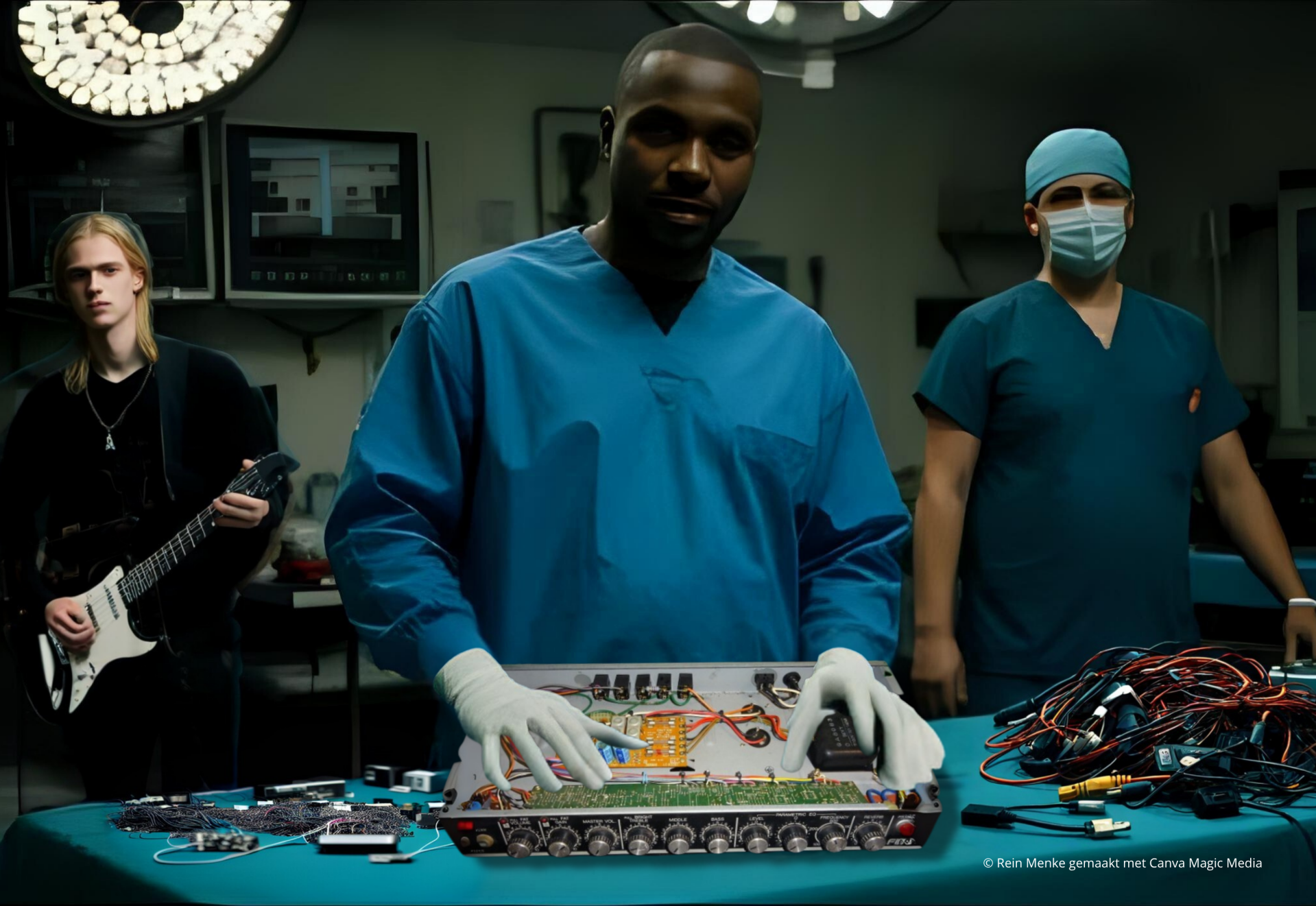 De woorden van de kakker galmden als een doodsklok door mijn hoofd, maar gelukkig bleek de gitarist ook een techneut te zijn. In een mum van tijd had hij de versterker gedemonteerd en lag er een kluwen van printplaten, kabeltjes en andere onderdelen, als de ingewanden van een ontweid buitenaards wezen, op de vloer. Het toekijken naar hoe hij de nieuwe schakelaar monteerde maakte me misselijk. Het deed me denken aan een operatie en het was dan ook pas na het sluiten van de patiënt dat ik opgelucht kon ademhalen.